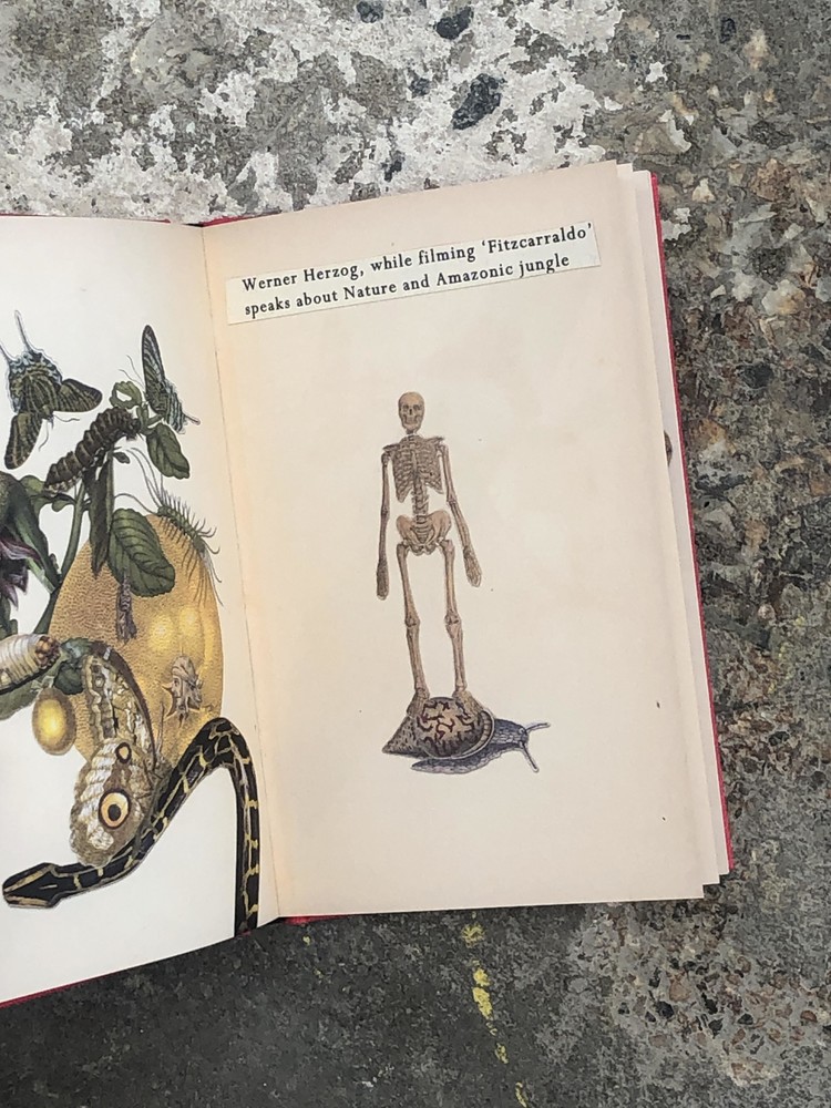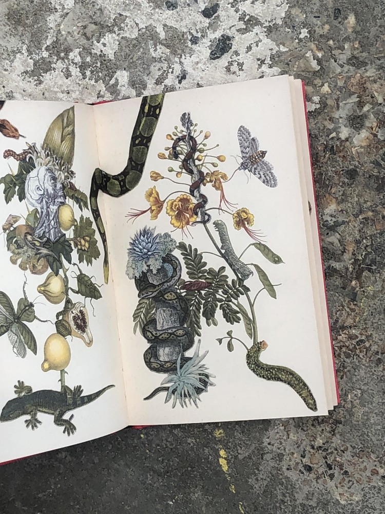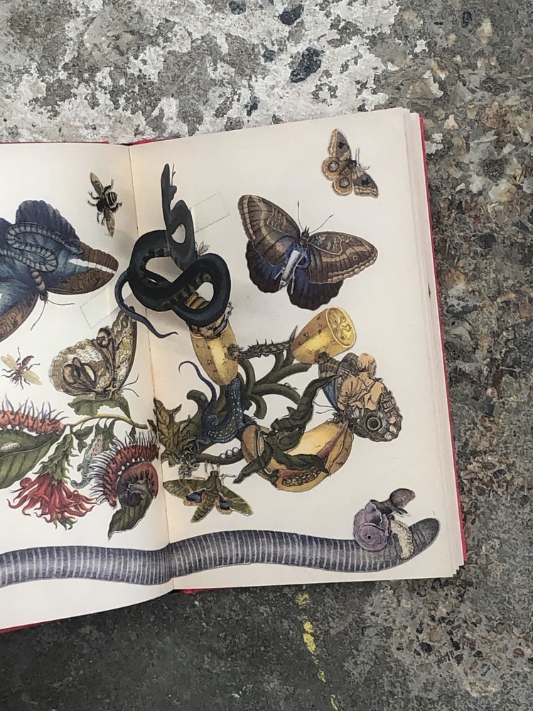 This artist book was created by photographer Linda Connor through the addition of collage work to the original Das kleine Buch der Tropenwunder (The Little Book of Tropical Wonders, 1954), which features illustrations by German naturalist, entomologist, and illustrator Maria Sibylla Merian. Linda Connor’s playful and bizarre imaginative world is superimposed upon Merian’s descriptive illustrations of plants and insects. Her bold and free collages, which frolic with or crash into the flora and fauna drawn by Merian, extend beyond observation and understanding into the instinctive realm of sensation and imagination. The untamed energy and surreal world we have never encountered are reopened through the encounter between 17th-century European artist Maria Sibylla Merian and 21st-century American artist Linda Connor. The mystery of nature, the paradox of life and death, and the adventurous spirit of artists who open up unknown worlds — despite all odds — have transcended time and place to become a small book for us, here and now.