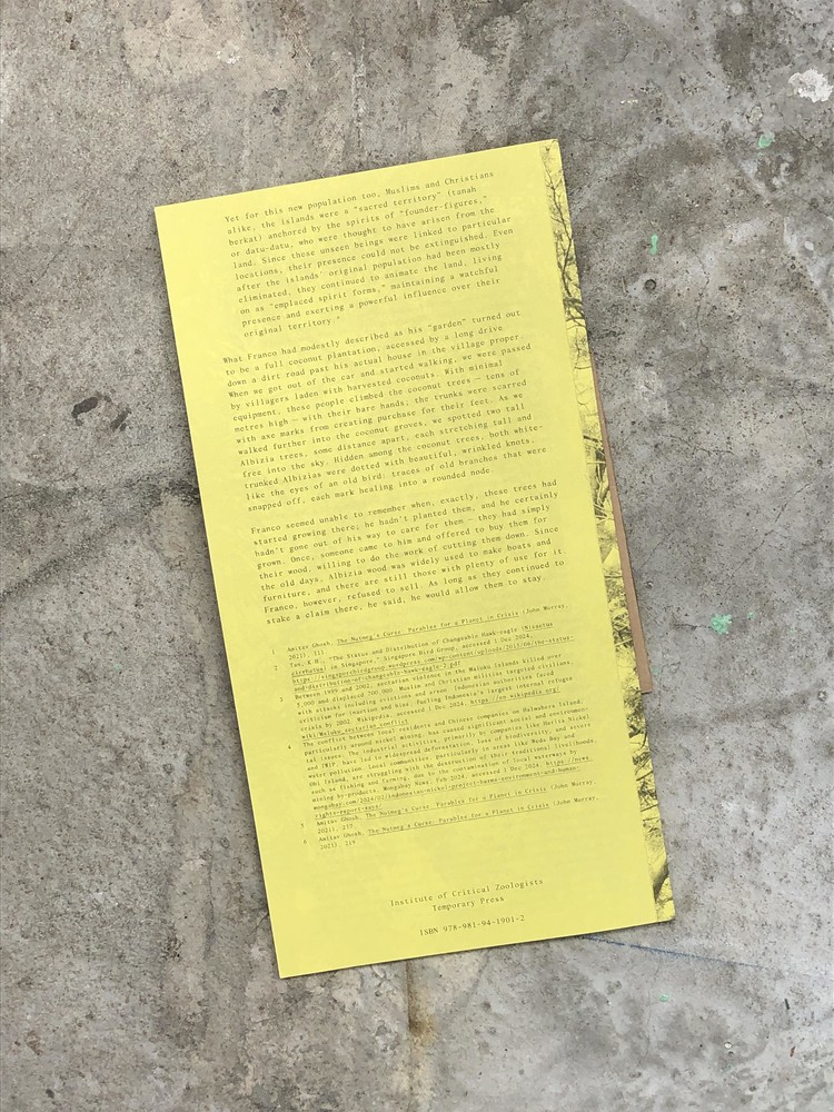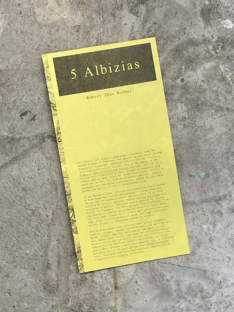 이 책은 싱가포르 전역에서 발견된 네 그루와 말루쿠 제도에서 온 한 그루, 총 다섯 그루의 알비지아를 기록한다. 이들은 인간의 행동이 어떻게 이 공간들을 형성했는지 살펴보며, 토착종과 비토착종, 자연과 인공의 모호한 경계를 탐구하고, 종종 바람직하지 않은 나무로 여겨지는 알비지아가 교란된 공간을 재야생화하는 데 미묘하지만 강력한 역할을 수행하는 방식을 보여준다. 이 프로젝트는 종종 간과되는 이 나무들을 조명함으로써 끊임없이 변화하는 싱가포르 환경 속에서의 회복력과 적응력을 재정의한다. 김해주의 에세이와 아카이브 사진으로 구성된 서문을 수록했다. 알비지아 나무가 발견되고 기록된 싱가포르 내 네 곳의 장소를 순회한 동명 전시회와 함께 출간되었다.