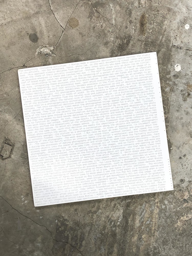 Laura Bielau’s photo book "Arbeit" (Work) is about the actual space of her work as a photographer and artist: the studio in which she operates. One aspect of the work centres on what she finds in this space, the resources she has at her disposal there, and the way she moves in it. Beyond that, it is also about the space of production in which the photographic image appears, about the processes involved—and thus the formal decisions that she makes as an artist. And it is about the space of ideas, the intellectual exploration, in other words, that she incorporates into her work. All these different facets provide the structure for Bielau’s work—and she is not alone here—and have led her to this specific work, whose title, which is both succinct and profound, encapsulates what working as an artist is all about: transforming an idea into a concrete piece and then showing the work in exhibition.