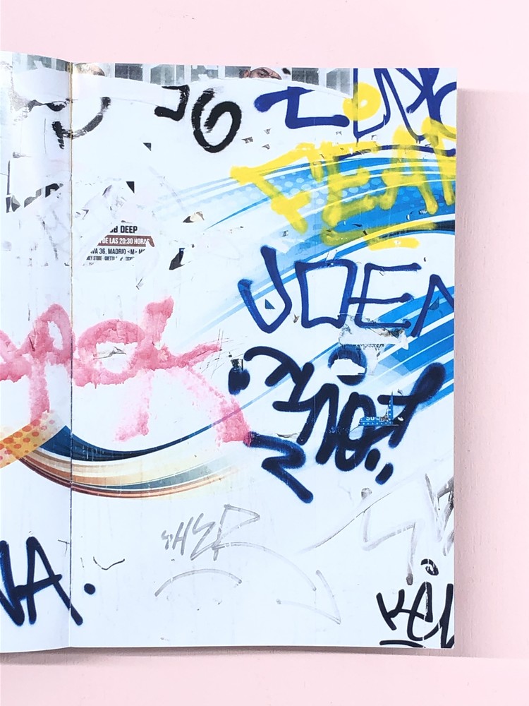 Xoubanova’s book “Graffiti” evokes the urban artistic movement that appeared in the 1970s in New York, renowned for its egocentric and identity-affirming dimension. It is the act of marking public space in the city with one’s name, of repeating one’s tag from street to street, of declaring one’s existence that interests Xoubanova here. In this phenomenon he sees a parallel with current social media practices and contemporary advertising discourse that he has been studying for a long time. Xoubanova devoted four years to building this hybrid body of photographic work, which brings together images alluding to a range of subjects, from communication and nature to social networking. The sequence of images illustrates and organizes the multiplicity and redundancy of an ever more vital affirmation of self (whether individual or collective)in the book shape. By getting over the rules (no cover, no appearing binding, unstructured pages layout) the book echoing to the uses of Graffiti. This leading to an object qualified as baroque.